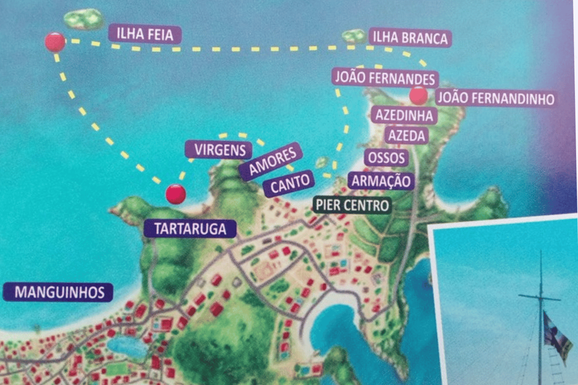 Praia da Armação, Praia dos ossos, Praia azeda, Praia da azedinha, Praia de joão fernandes (1° parada), Praia de joão fernandinho, ilha branca, ilha feia (2°parada), praia da tartaruga, praia da tartaruguinha (3° parada), praias da virgens, praia dos amores, praia do canto, ilha do caboclo e orla bardot.
