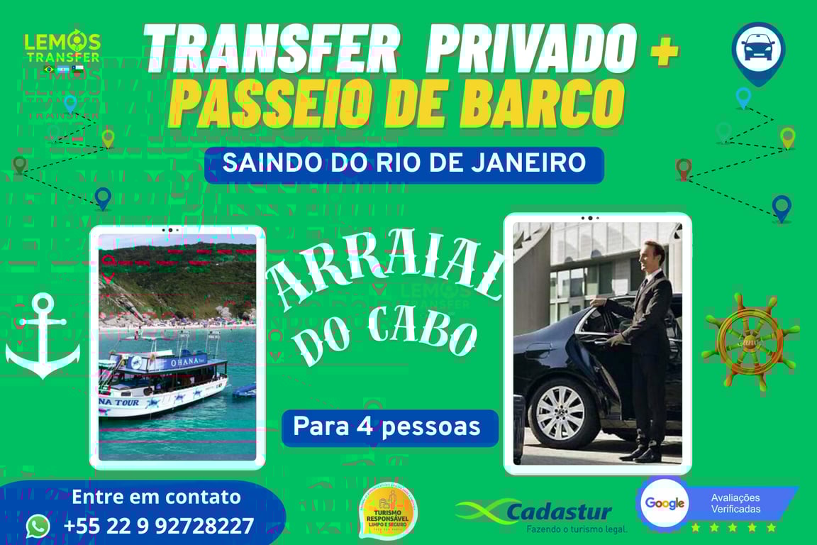 ✔️ Inclui o transfer privativo (ida e volta) e o passeio de barco com paradas nas principais praias e pontos turísticos de Arraial do Cabo.